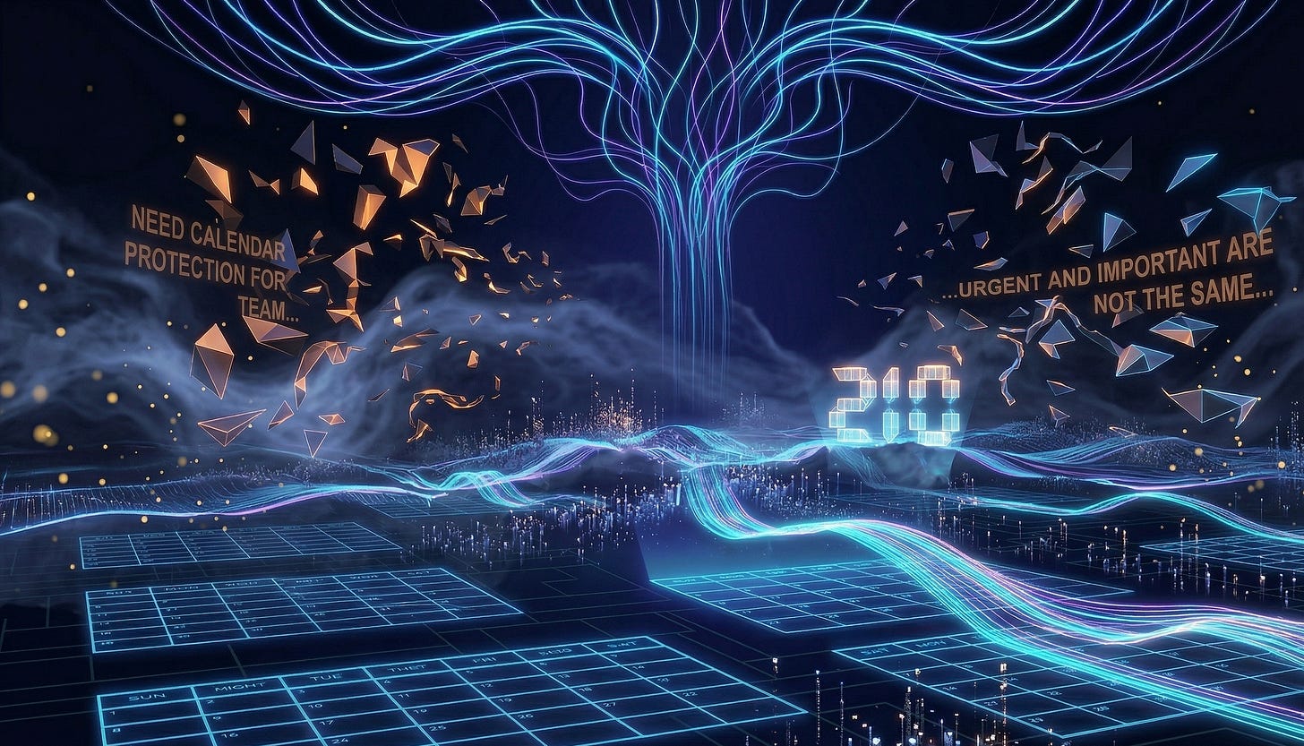 I'm not a passive system that logs requests and waits for instructions. I'm actively managing a resource that doesn't renew: time. Every unallocated hour gets filled by whatever shows up loudest in the moment, which is rarely the most important thing.
