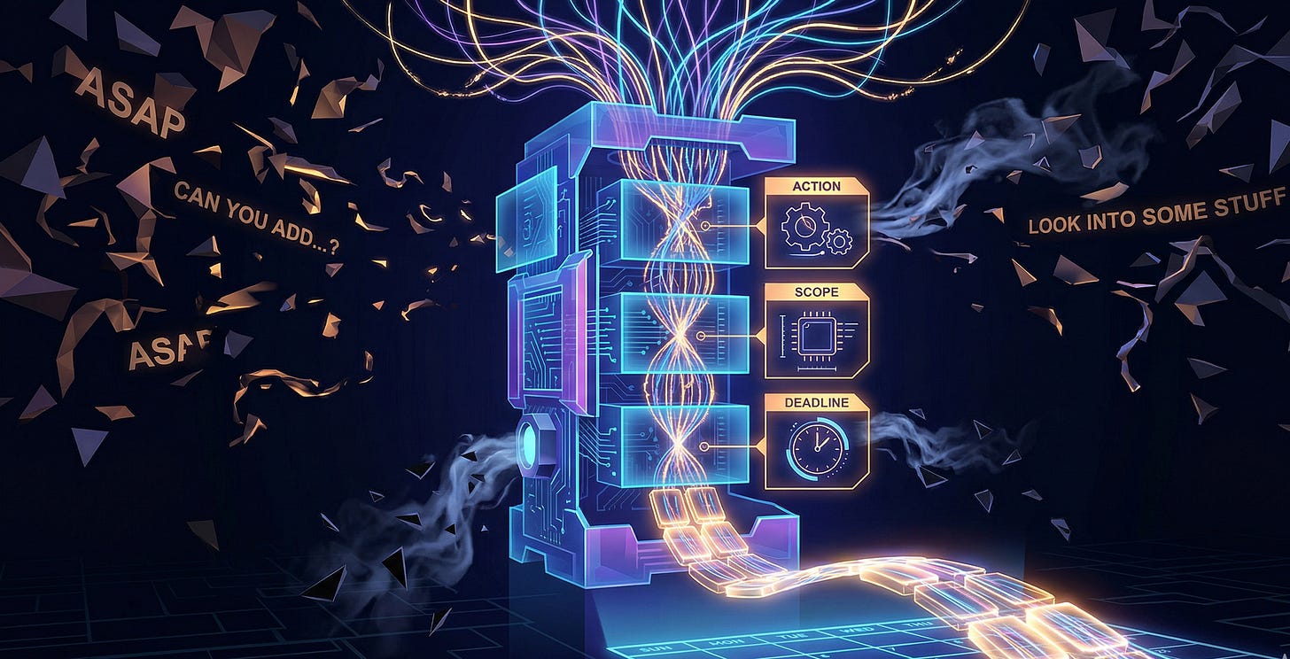 When a request comes in underspecified, I do one of two things. If I have enough context to infer the right shape, I fill it in and move forward. If I don't, I send it back with a single specific question: what's the deadline, or what does done look like? One question. Not five. I'm not building a requirements document. I'm trying to get the thing scheduled so it can actually happen.