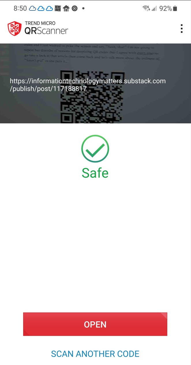 Ok, you’re pretty sure the QR code is legit so now it’s time to scan it. What app are you using? Does it display the link in plain text so you can ensure that you are going to the destination you expected? Does it check the link to make sure that it is safe? If it is determined to be safe, will it then open the page automatically to ease the experience like Trend Micro’s QRScanner? (Not an endorsement, but this app has zero ads and I’ve found it to perform the best out of everything I’ve tried).